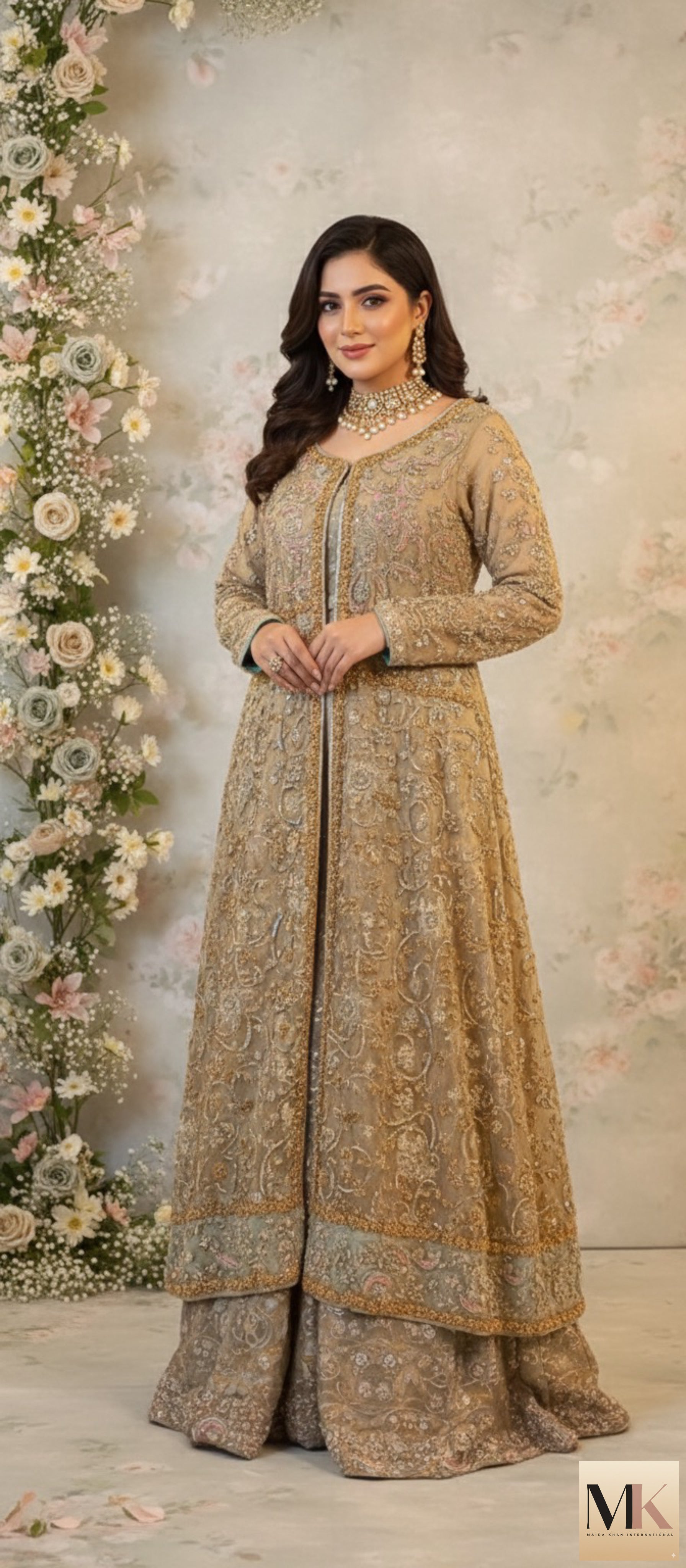 Zeenat is a timeless gold ensemble featuring intricate embroidery and a flowing silhouette. Designed with refined detailing and classic craftsmanship, it’s perfect for weddings and formal occasions.