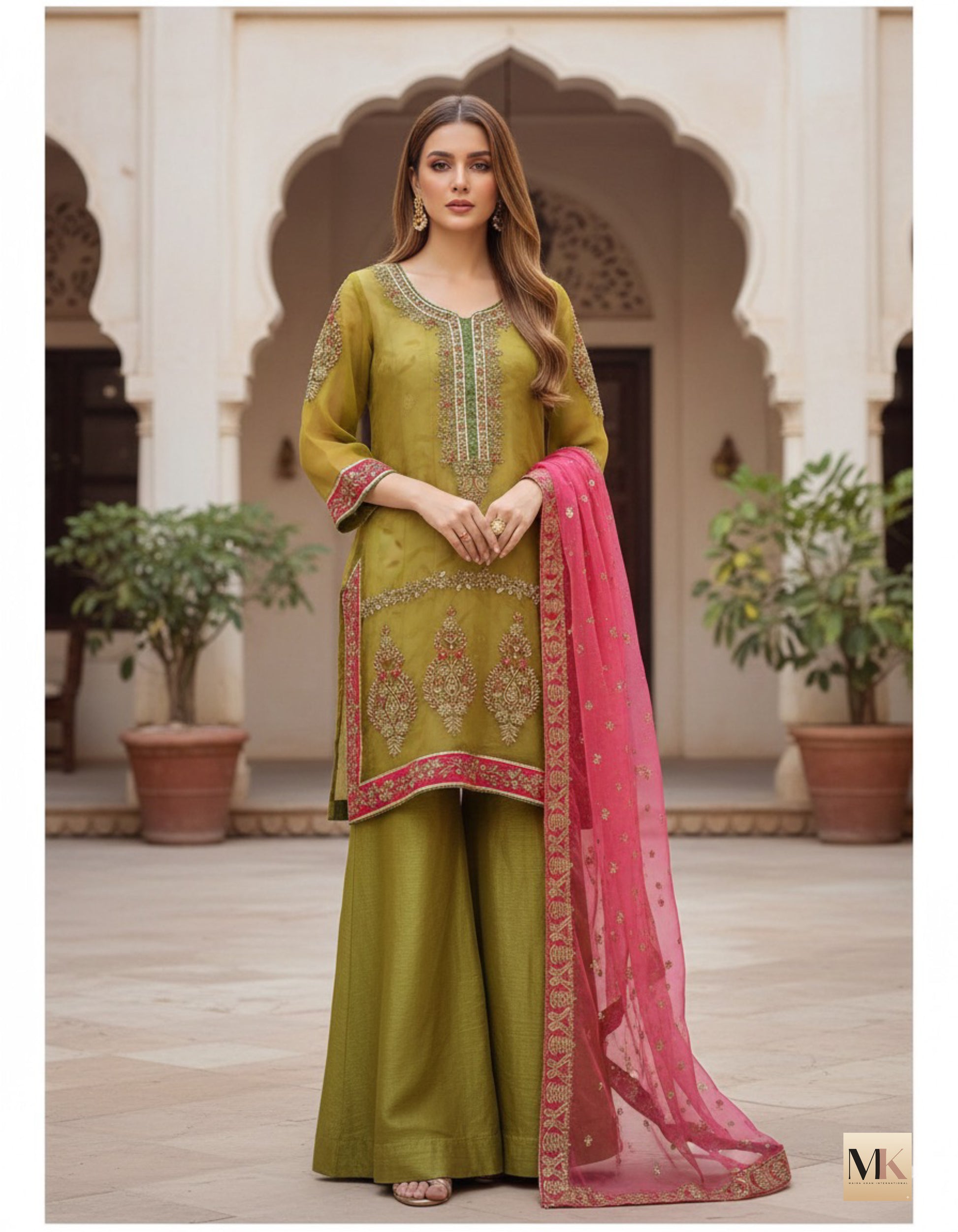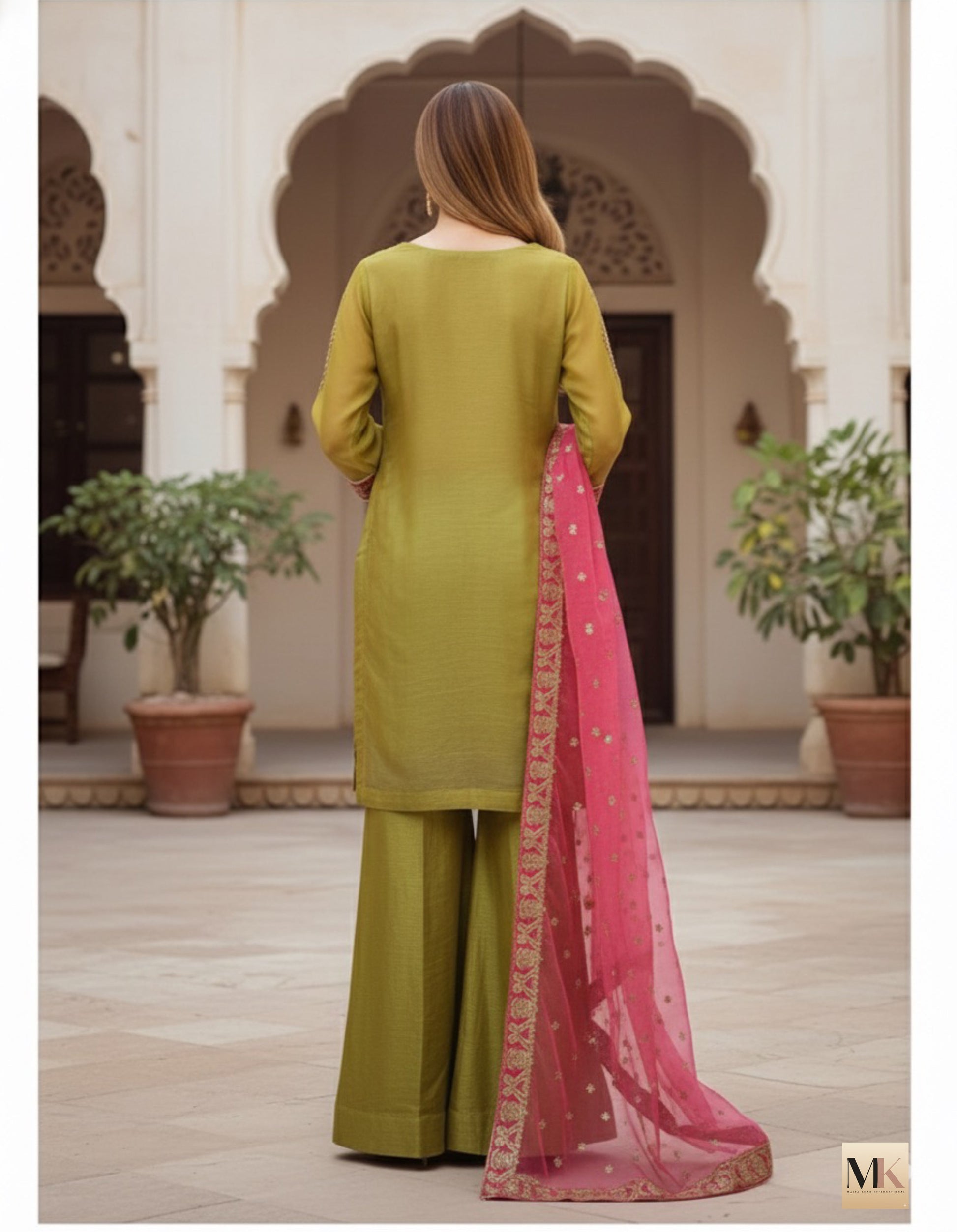 Zaitoon is a graceful ensemble in soft olive tones, detailed with intricate embroidery and finished with a vibrant rose-hued dupatta. Balanced, elegant, and timeless, this look is perfect for mehndi gatherings, festive occasions, and intimate celebrations.
