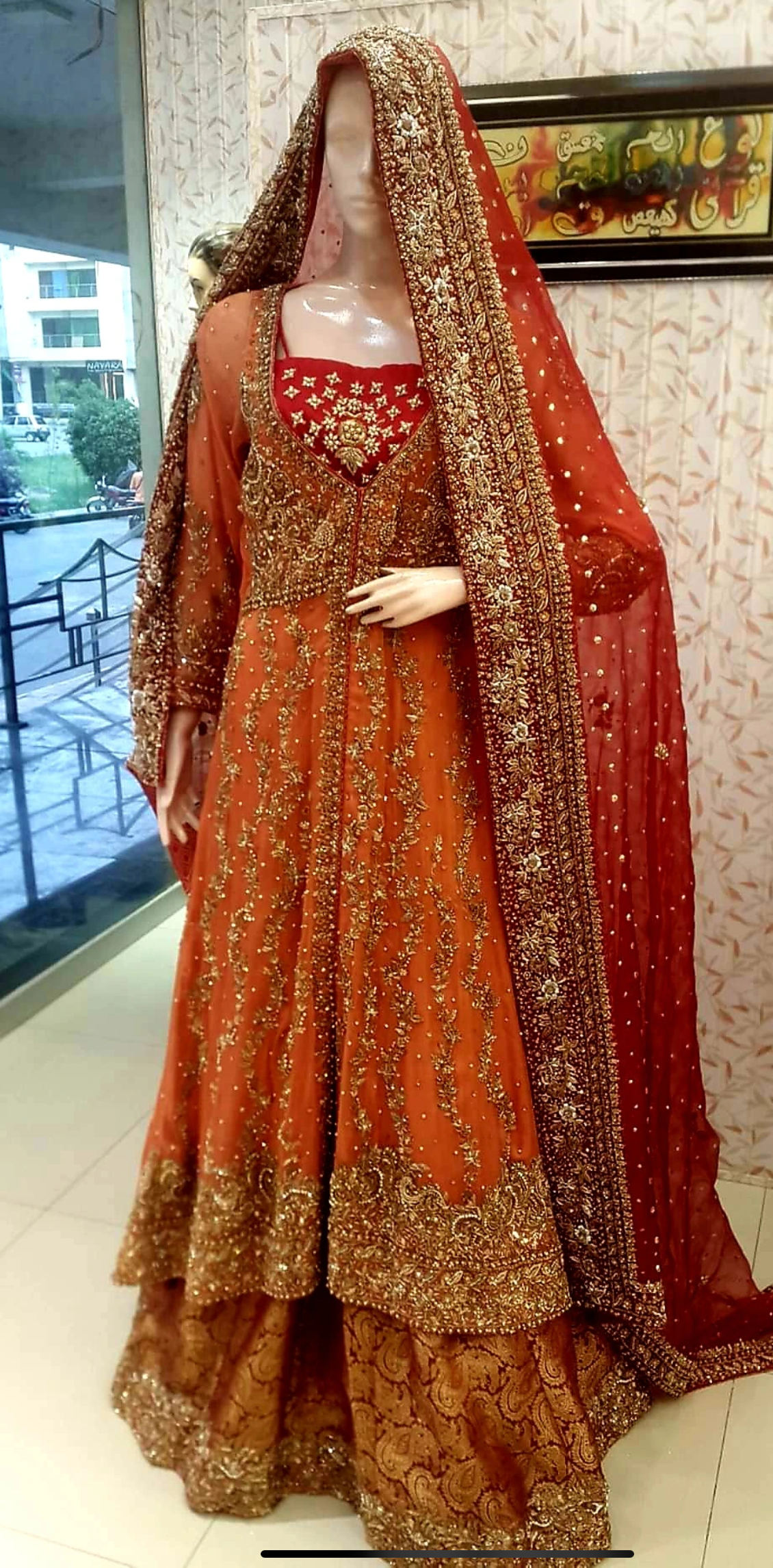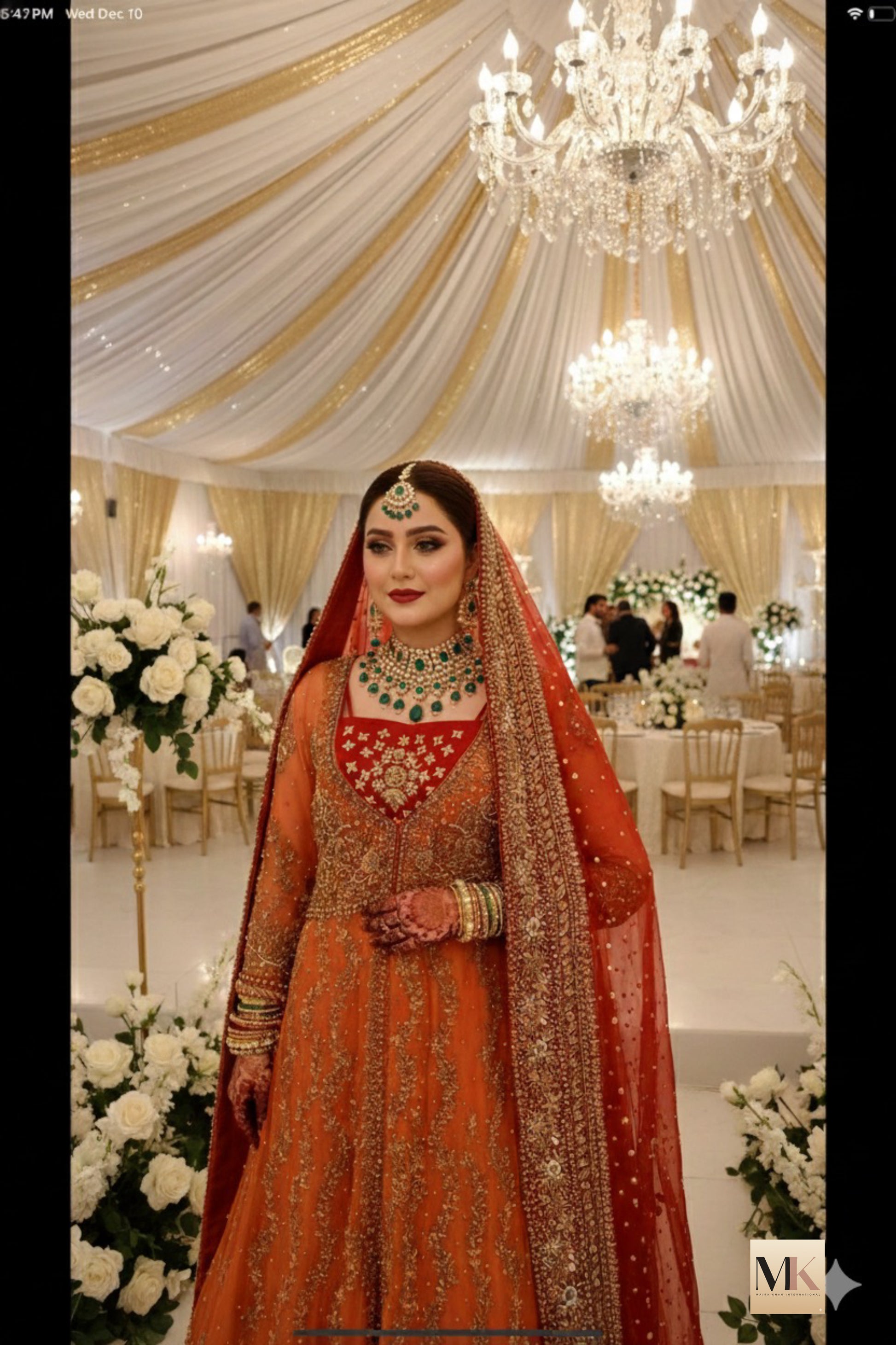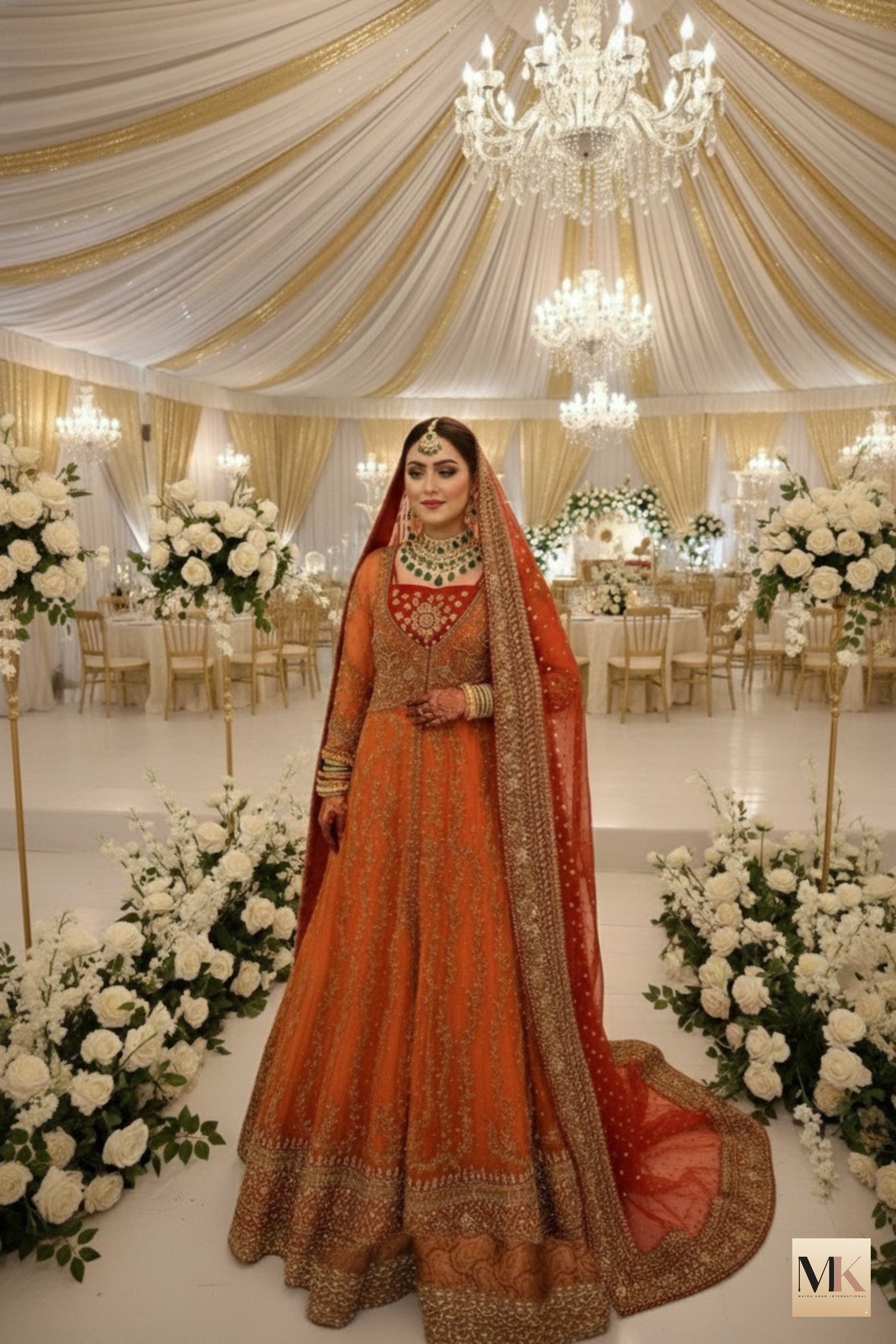 Kesar is a radiant bridal ensemble in warm saffron tones, adorned with intricate gold embroidery and refined detailing. Designed with a graceful, flowing silhouette and paired with a richly embellished dupatta, this look embodies timeless elegance and royal bridal charm.