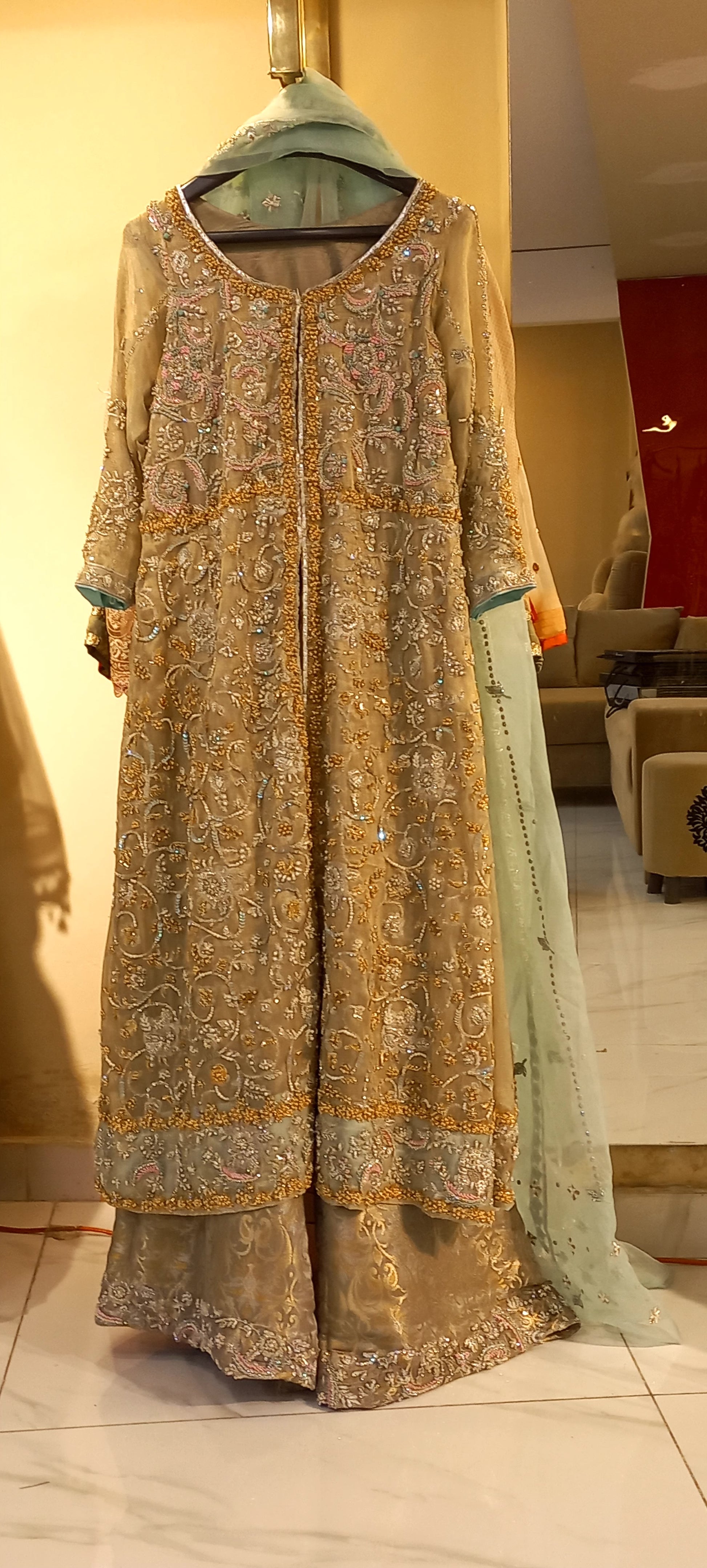 Sunehri Noor is a refined ensemble in warm gold tones, adorned with delicate embroidery and paired with a soft mint dupatta for a graceful contrast. Designed with a flowing silhouette and timeless detailing, this look embodies understated elegance—perfect for weddings, festivities, and formal occasions.