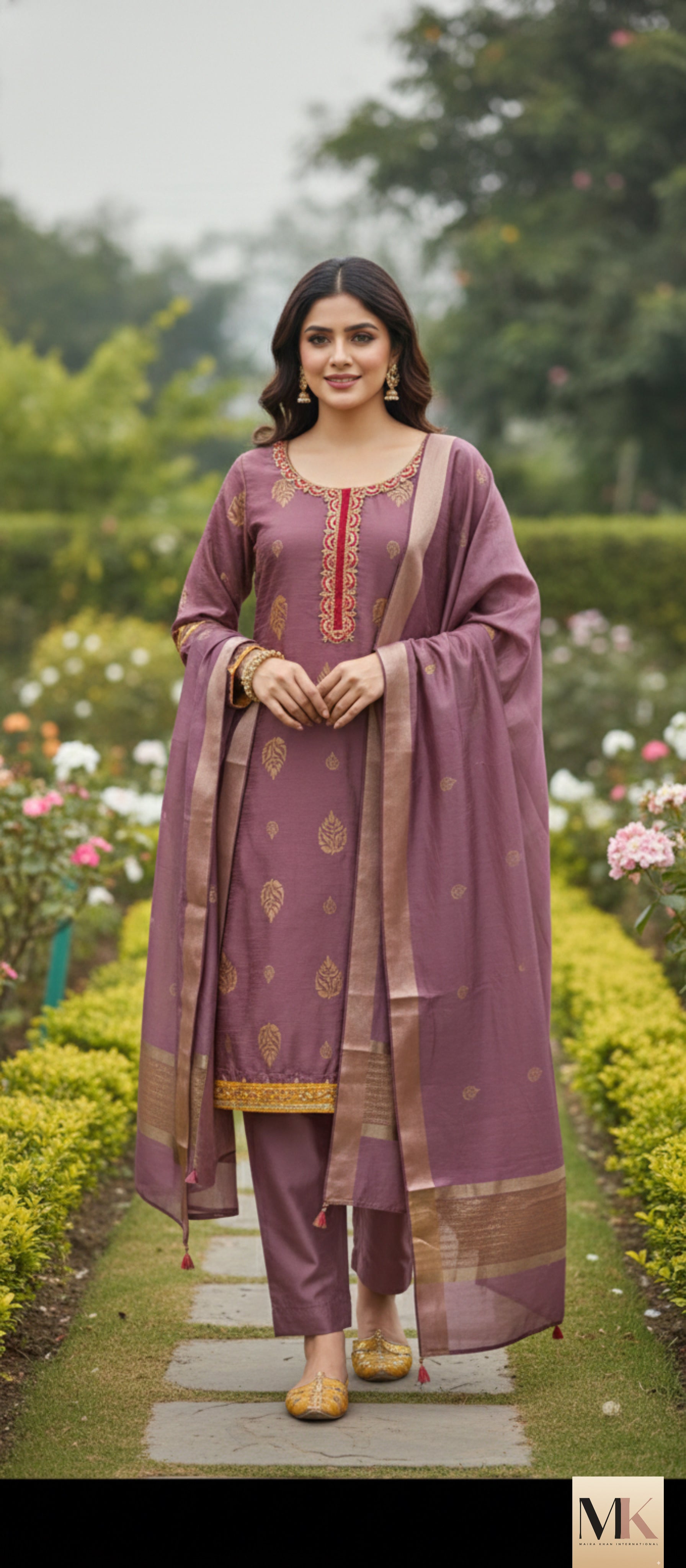 A muted mauve rawsilk shirt featuring a straight silhouette with scattered woven motifs and detailed embroidery along the neckline and hem, paired with matching trousers and a coordinating dupatta finished with a subtle border that adds structure and balance to the look.