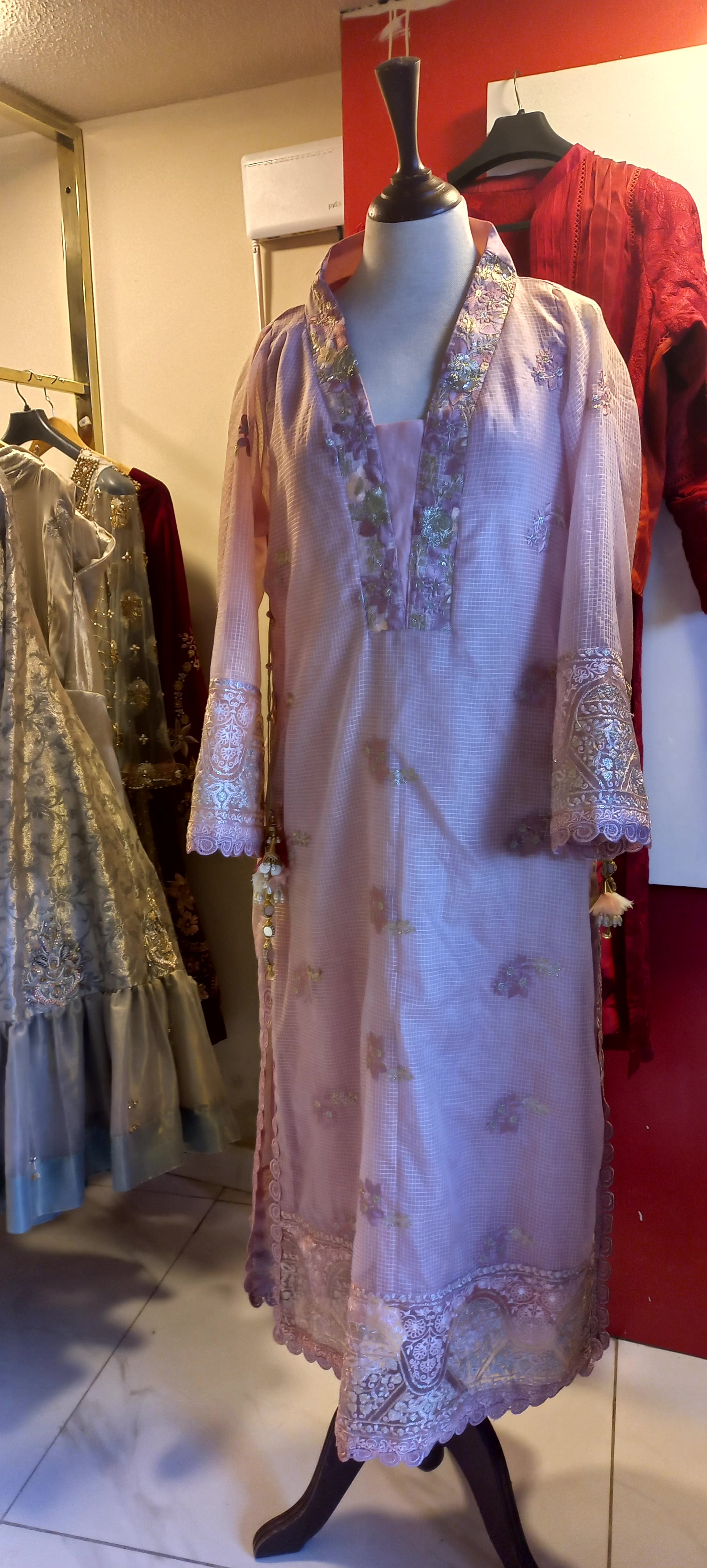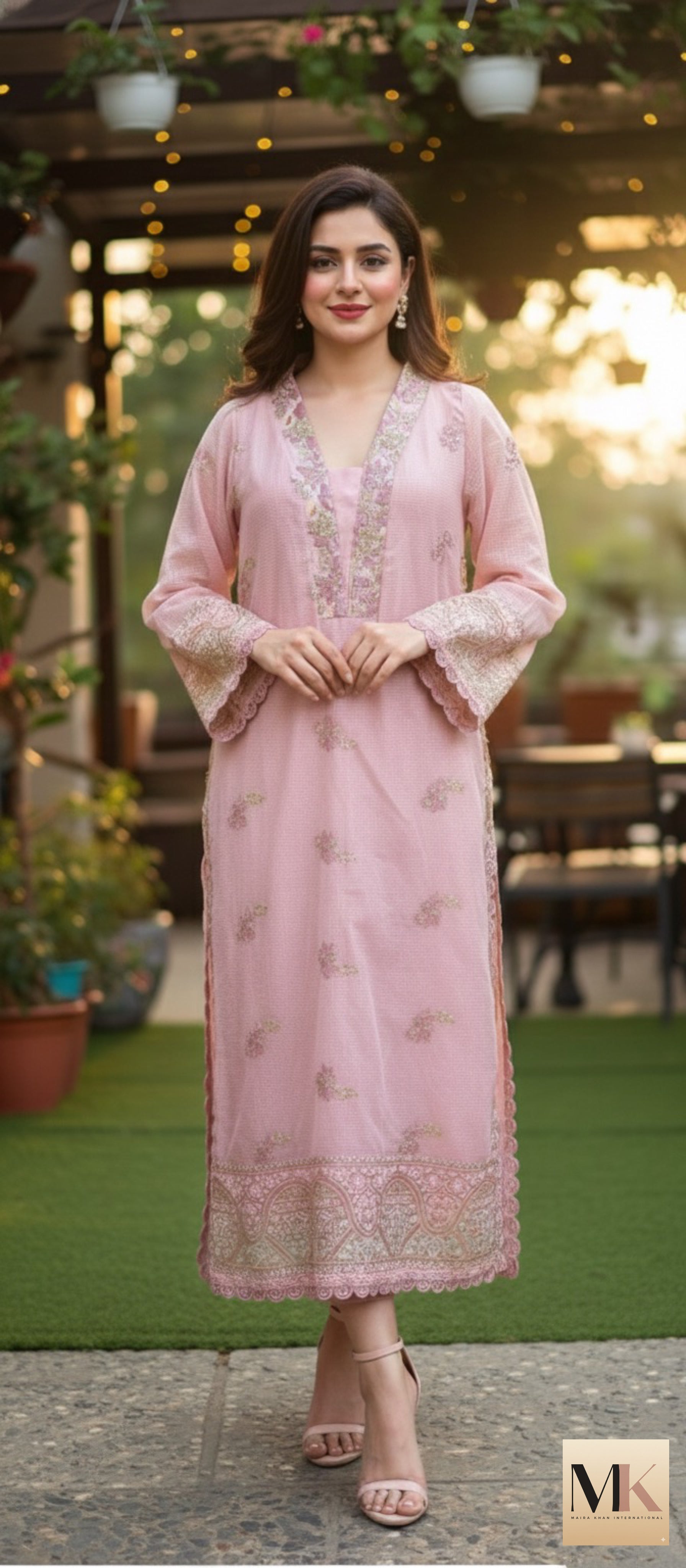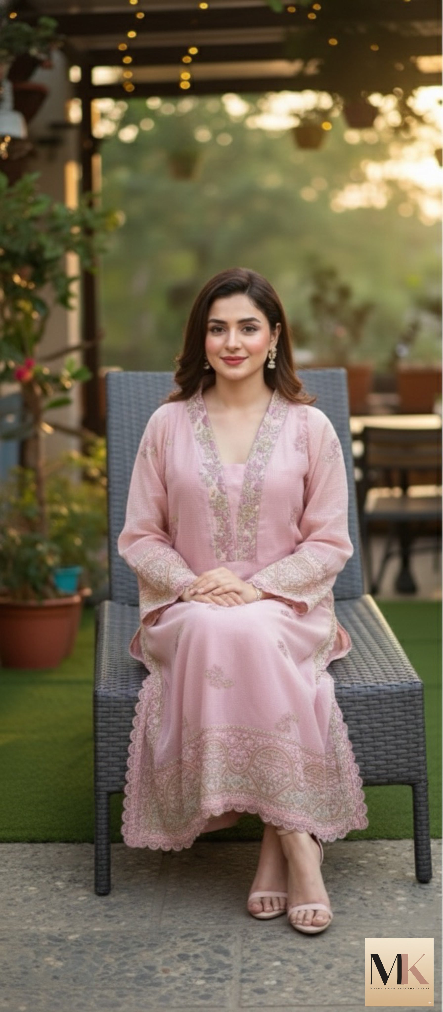 A soft blush ensemble with delicate embroidery, paired with a sheer organza dupatta that adds effortless grace and light movement.