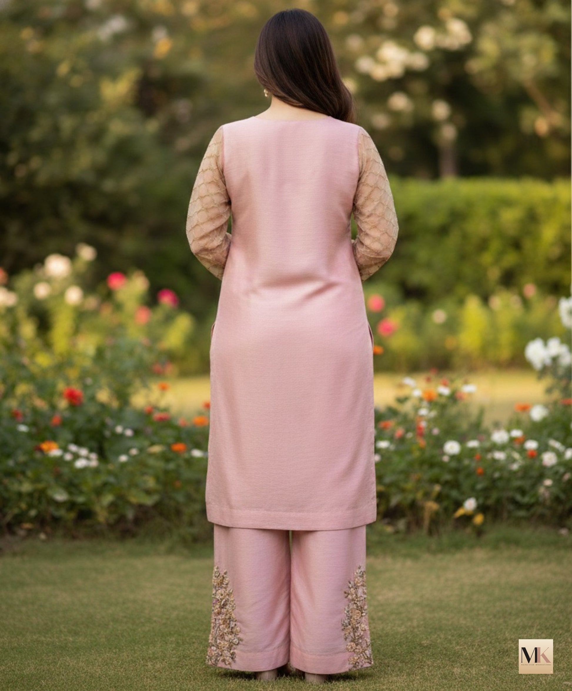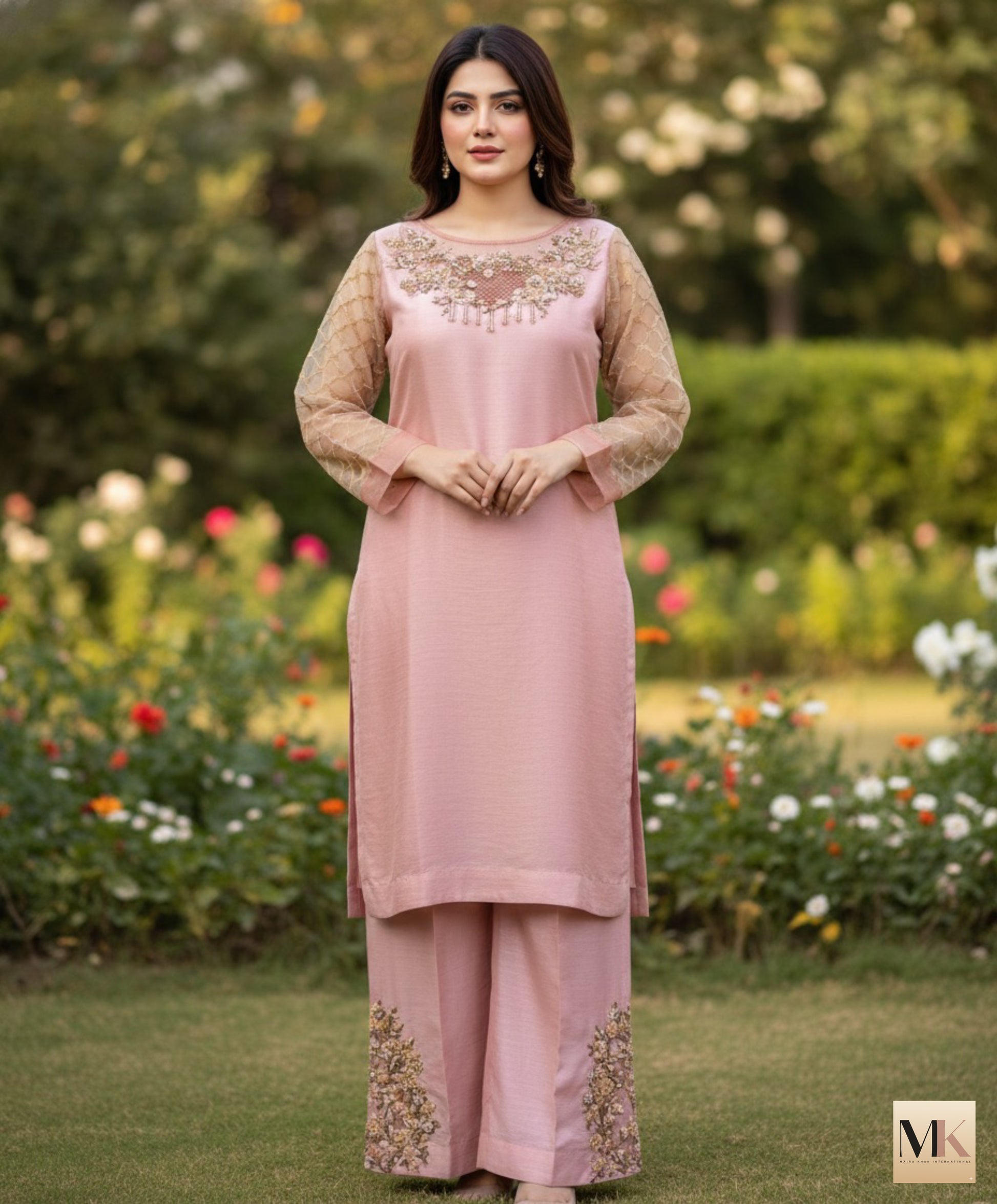A minimal ivory-beige silhouette paired with an ornate teal dupatta, offering quiet luxury through refined detailing and effortless drape.