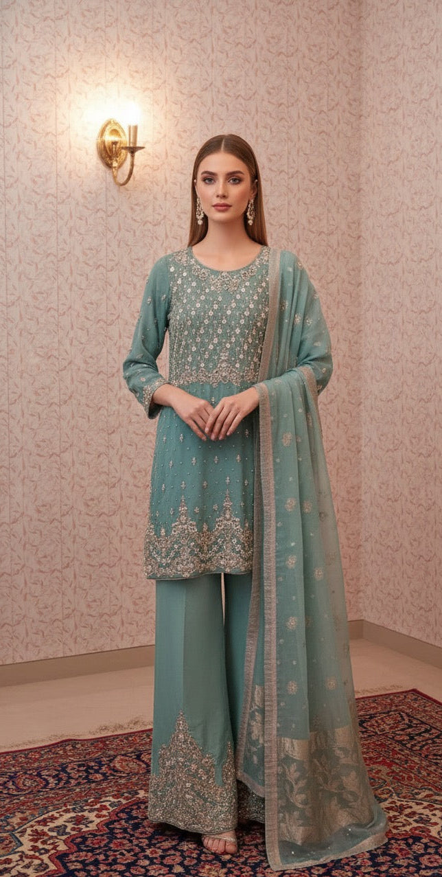 Firuzeh is a soft sea-green ensemble adorned with delicate embroidery and a flowing dupatta. Calm, refined, and luminous, it embodies effortless elegance with a modern, understated finish.