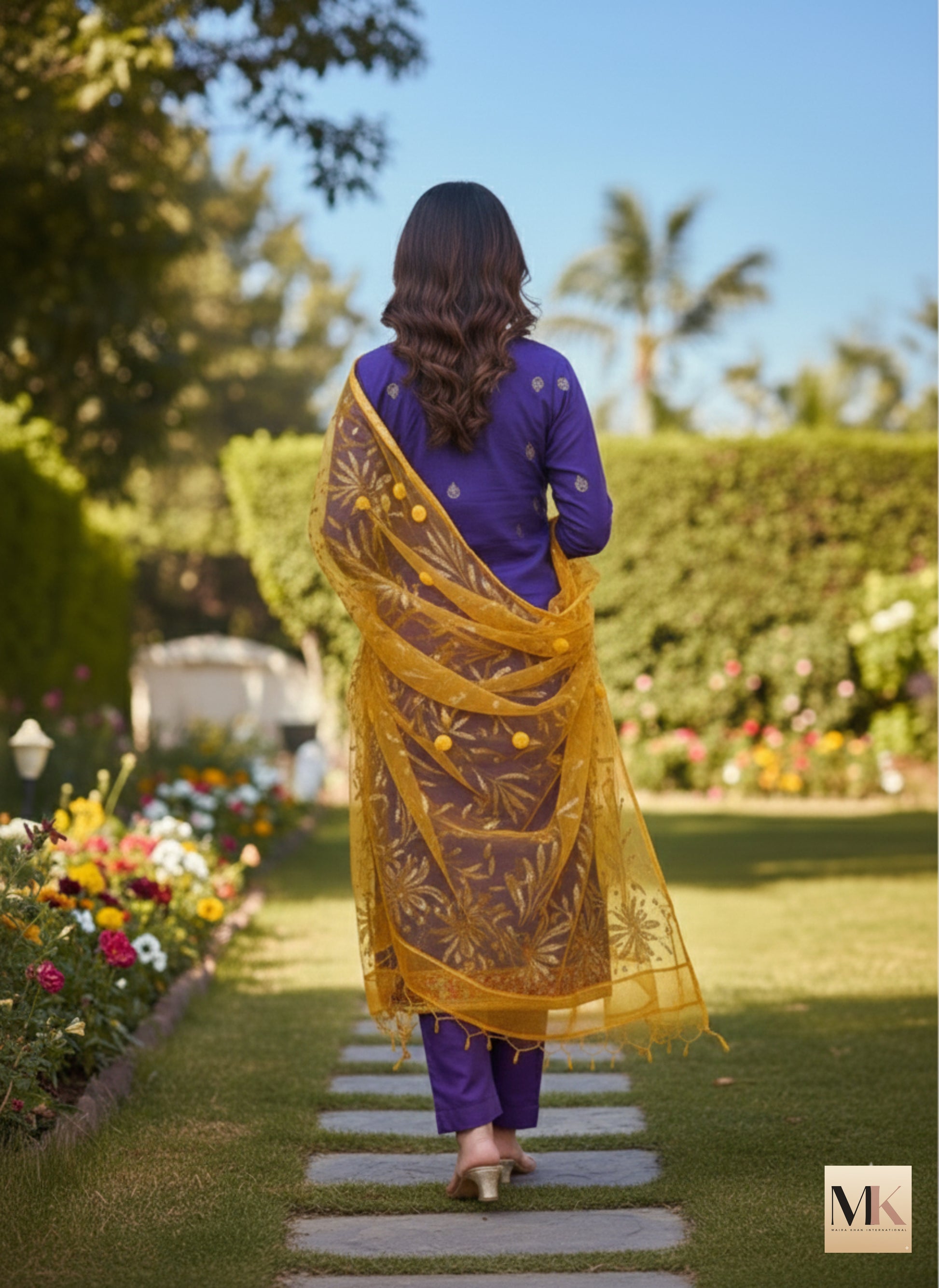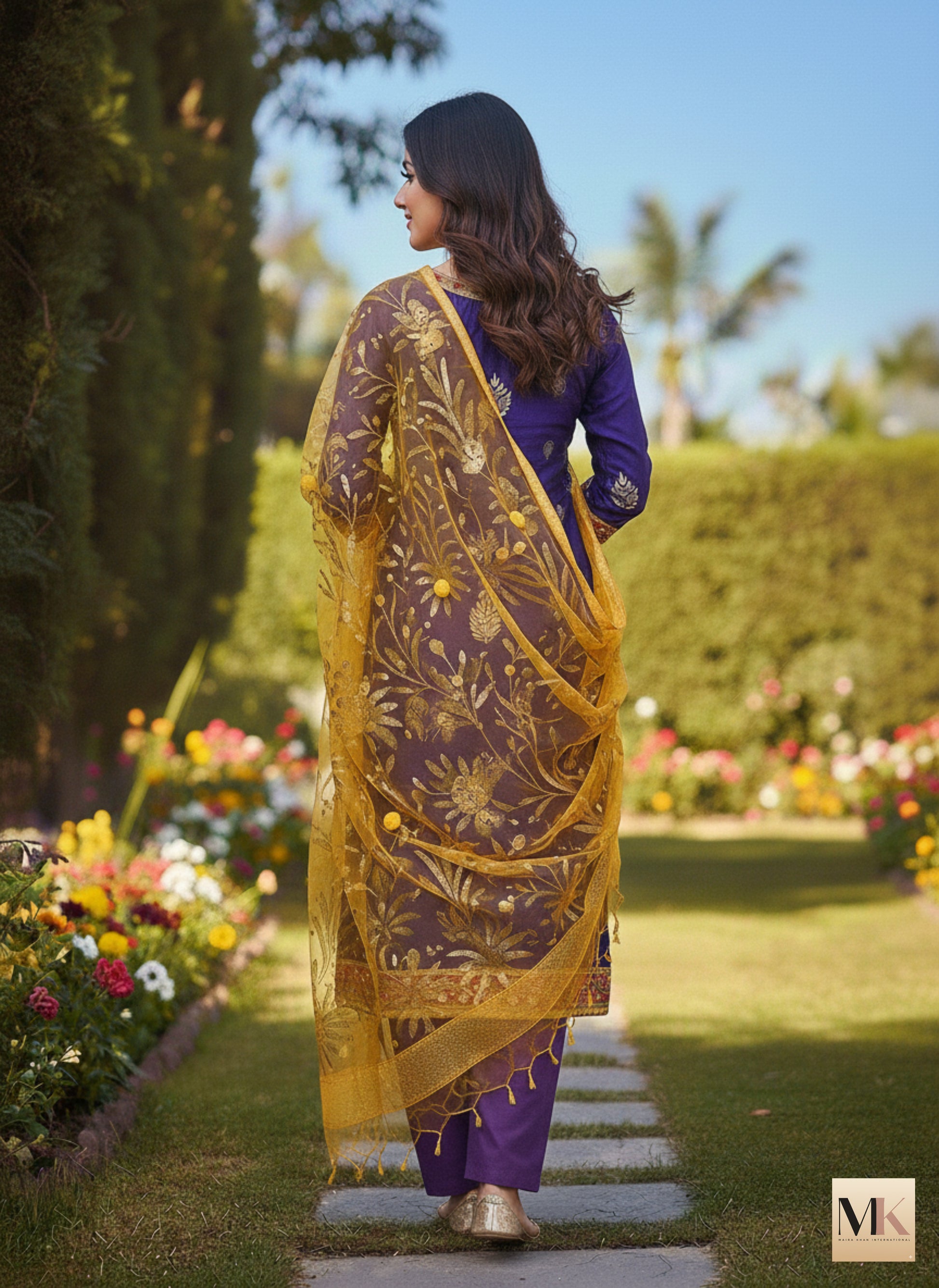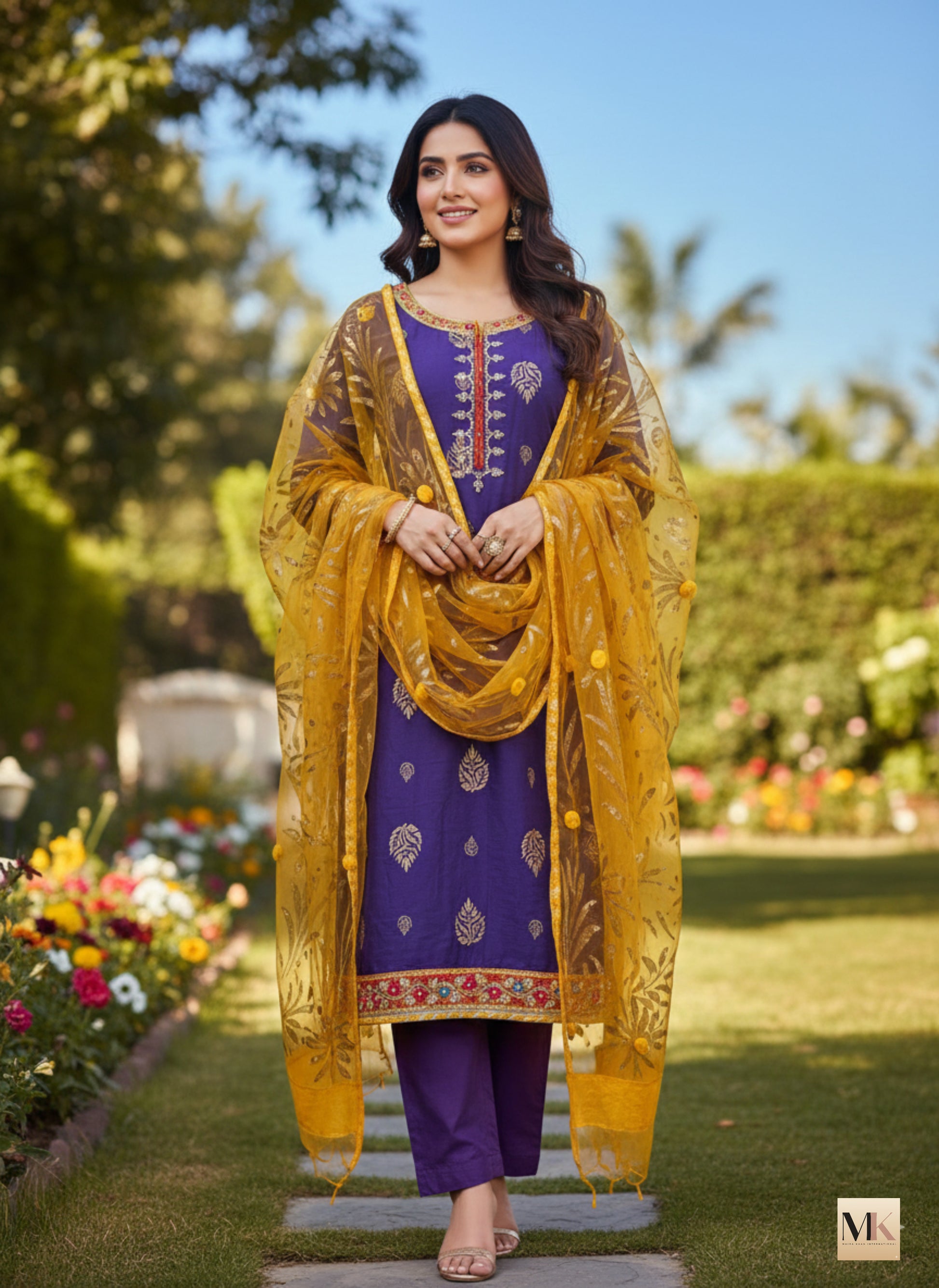 Sahar is a raw silk, deep violet kurta adorned with delicate gold motifs and an intricately detailed neckline, paired with straight-cut trousers. The ensemble is completed with a sheer mustard dupatta featuring subtle woven patterns, adding warmth and contrast to the look—perfect for elegant festive and formal occasions.