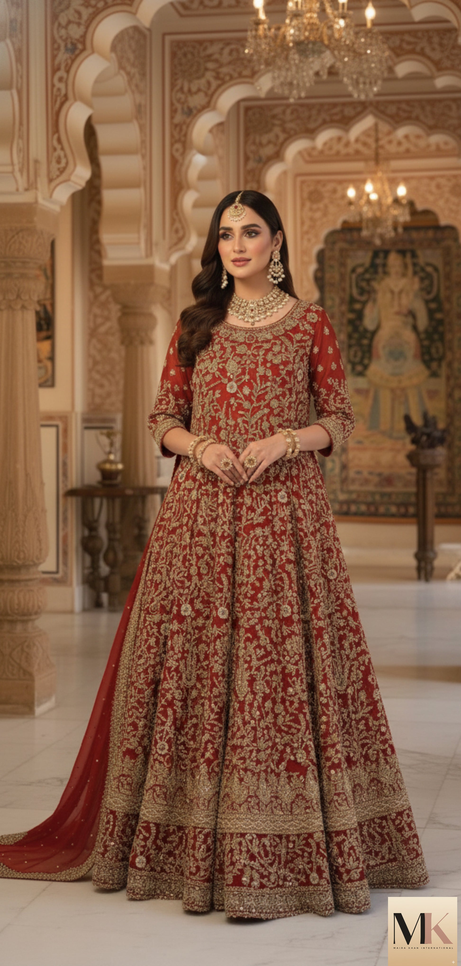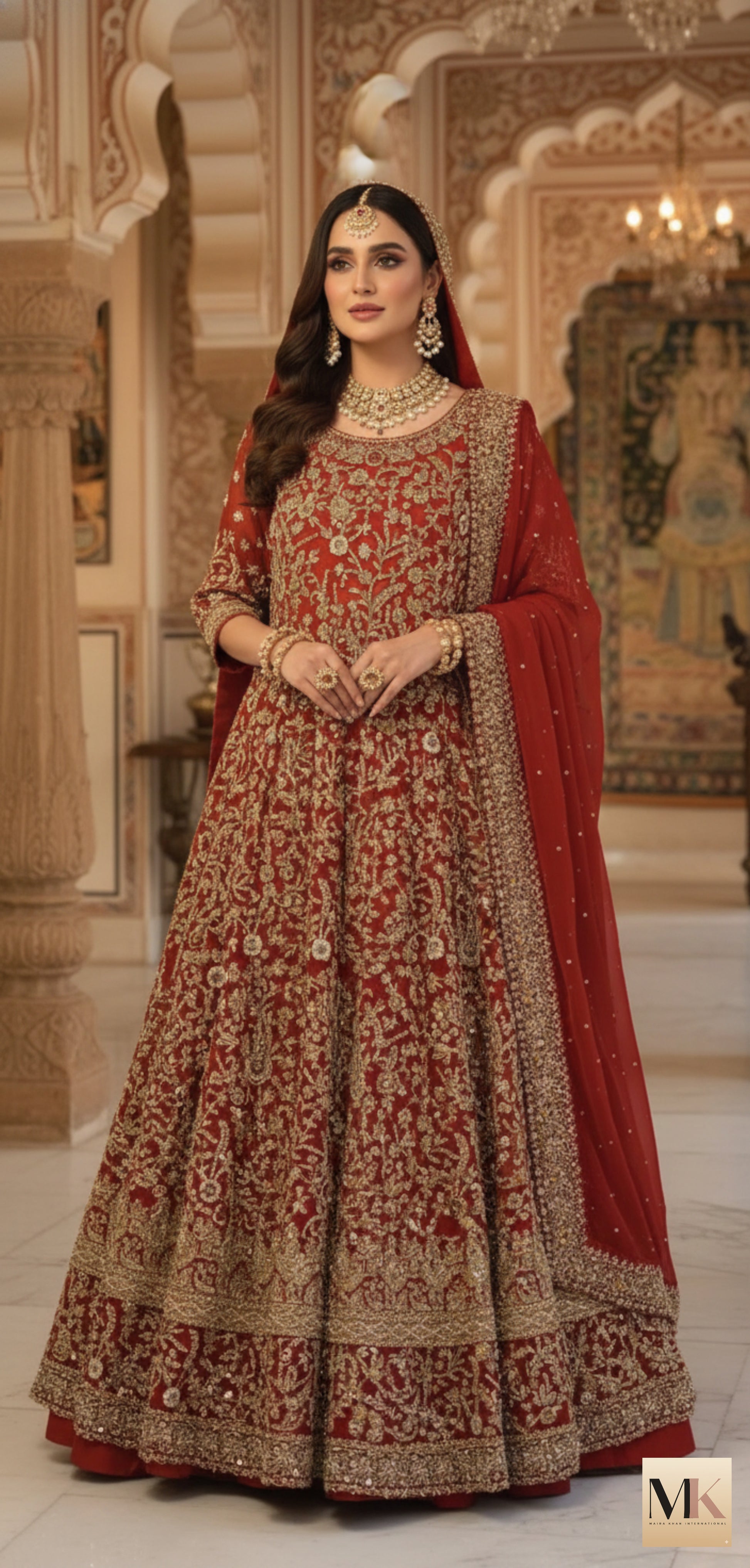 This bridal ensemble features a rich crimson base lavishly adorned with dense antique-gold embroidery, creating a striking all-over tapestry of traditional floral and vine motifs. The fitted bodice flows into a voluminous skirt with a heavily embroidered border, adding depth, weight, and regal movement to the silhouette. A sheer red dupatta, subtly embellished and softly trailing, enhances the grandeur without overpowering the look. Paired with classic bridal jewelry, the ensemble embodies timeless Mughal-inspired elegance—designed for a bride who commands attention with grace and heritage.